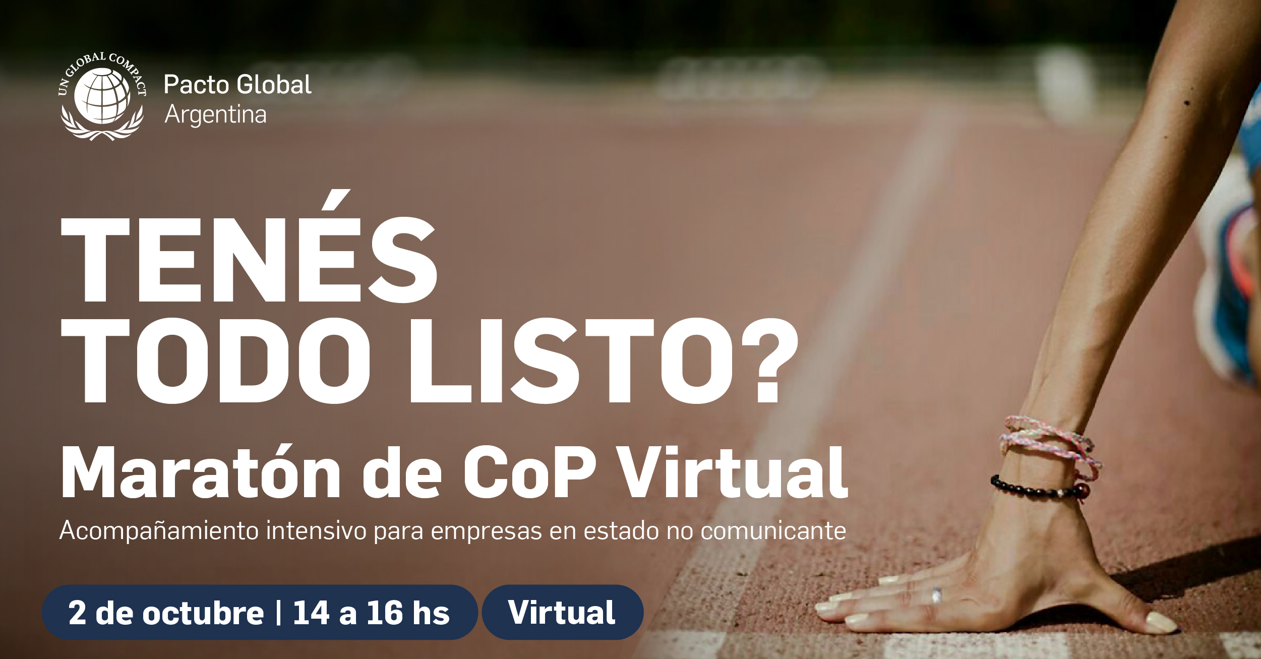 La Maratón de CoP Virtual es una jornada intensiva de apoyo organizada por Pacto Global Argentina, junto a la Red de Consultoras, para acompañar a las empresas adheridas al Pacto Global que actualmente se encuentran en estado no comunicante.